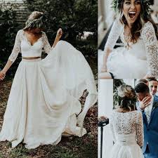 Boho Two Pieces Long Sleeves Lace Beach Wedding Dress 2019 Cheap Price In 2020 Lace Beach Wedding Dress Two Piece Wedding Dress Country Wedding Dresses