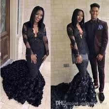 2019 Black Mermaid Prom Dresses 2k19 Evening Gowns With 3d Rose South African V Neck Sheer Long Slee Black Mermaid Prom Dress Prom Dresses Mermaid Prom Dresses