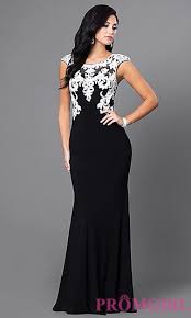 Black Floor Length Dress With White Lace Accents At Promgirl Com Black And White Prom Dresses Dinner Gowns Formal Dresses Prom