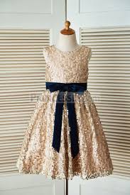 Champagne Gold Sequin Wedding Flower Girl Dress With Navy Blue Belt Wedding Flower Girl Dresses Gold Flower Girl Dresses Flower Girl Dresses Navy