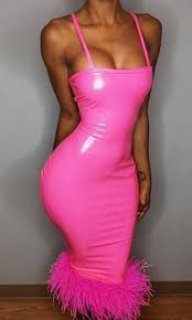 My World Hot Pink Pu Sleeveless Spaghetti Strap Square Neck Knee Length Feather Hem Bodycon Midi Dress Ropa De Neon Ropa De Moda Moda Para Chicas Con Curvas