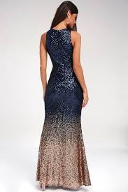 Infinite Dreams Rose Gold And Navy Blue Ombre Sequin Maxi Dress Blue And Gold Dress Navy And Gold Dress Blue Bridesmaid Dresses
