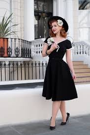 Pin up style black dress. However you have to be really keen when styling a pin up girl dress as you don t want to go overboard. Mix and match swing dresses with colorful fluffy petticoats and a hair flower. In detail the dress is a two toned flared midi pin up dress with the upper part filled with black and white pattern and the lower part being a black midi flared skirt.